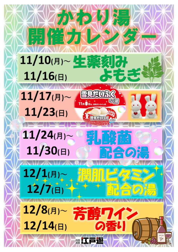 江戸東京博物館からほど近い場所にたたずむ「江戸遊」。白銀のひときわ大きな暖簾が、新しい江戸遊の入口です。進化した大浴場や岩盤浴、サウナで体をあたためるもよし。お休み処やエステでうたた寝をするもよし。身も心も、ほろほろと。ほぐれるようなひと時をお過ごしください。