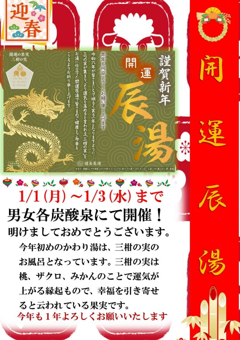 1/1元旦~1/3(水)は年始特別かわり湯「開運辰湯」を男女各炭酸泉で開催します♨