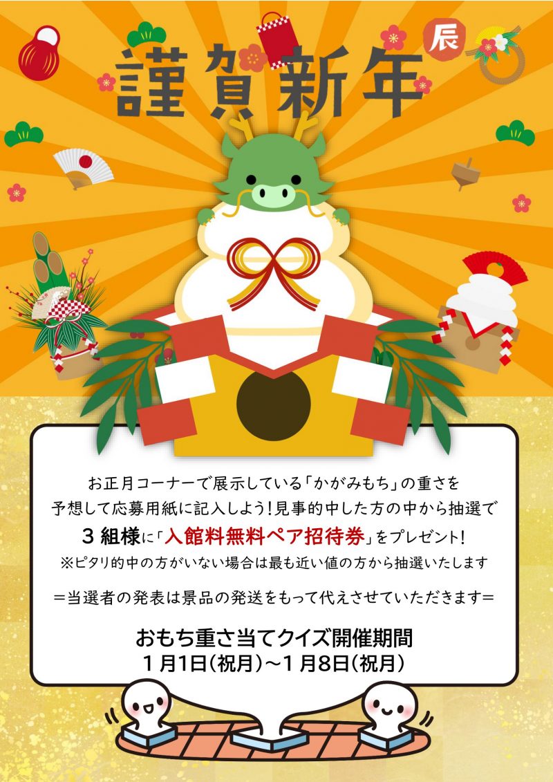 1/1元旦~1/8(祝)まで、1階ロビー奥特設コーナーにて、置いてある鏡餅の重さを予想して