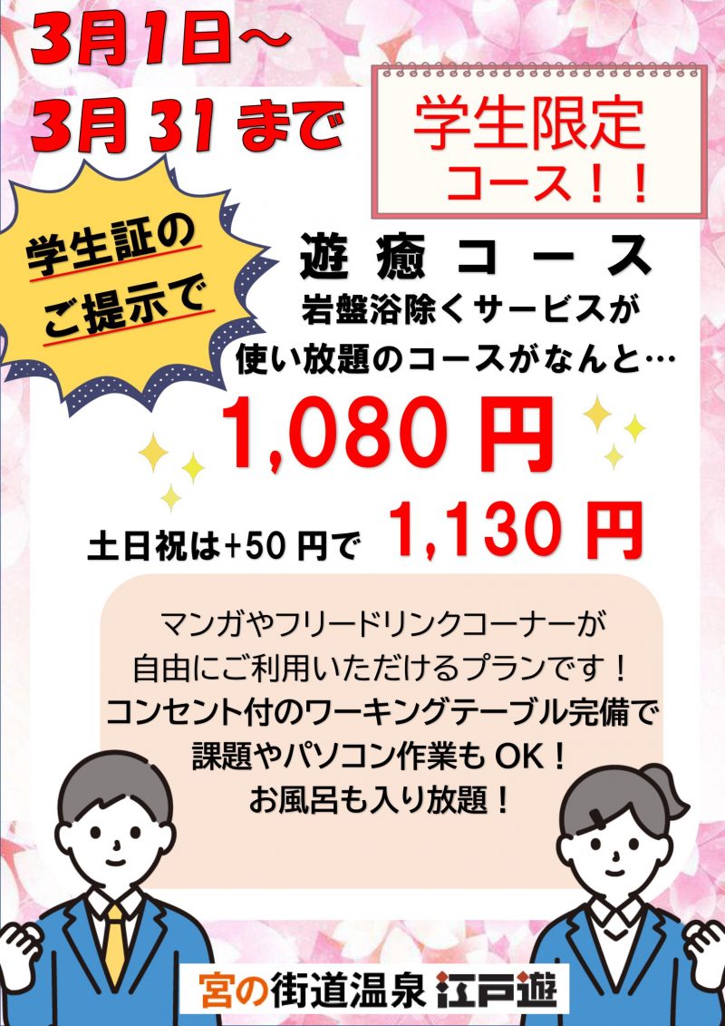 3/1(金)~3/31(日)「学生限定遊癒コースlight」1,080円!