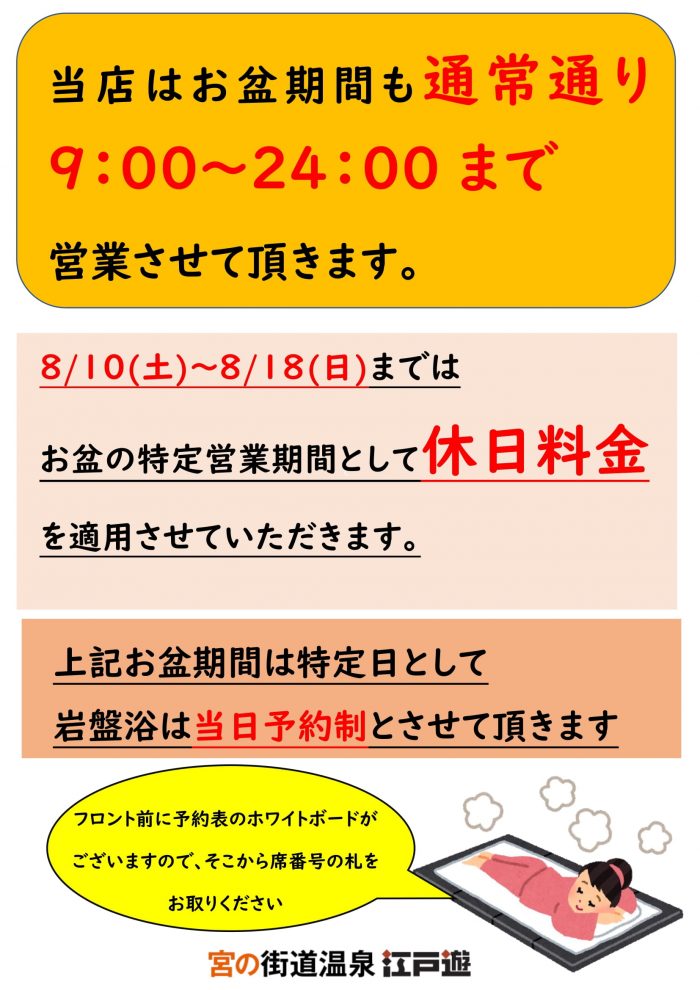 8/10(土)~8/18(日)までのあいだ、お盆の特別期間として休日料金を適用させて頂きます。