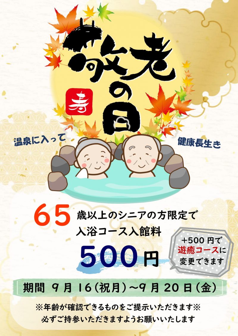 敬老の日記念特別割引 9/16(月祝)~9/20 65歳以上の方は入浴コース500円!