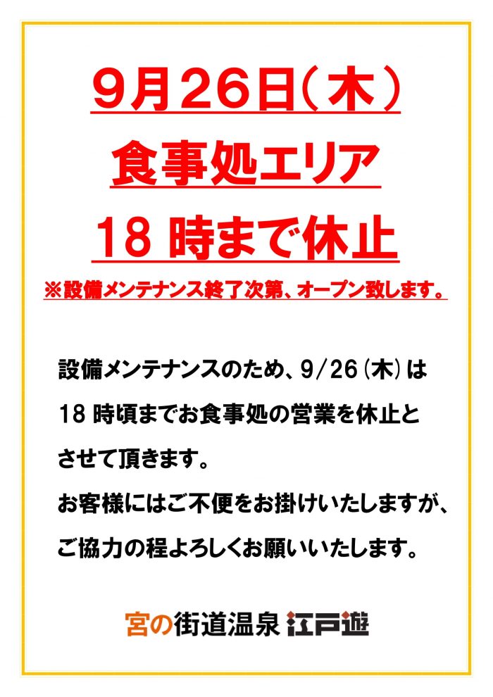 9/26(木)お食事処 18時頃まで営業休止のお知らせ