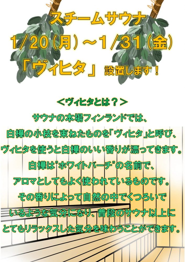1/20(月)~1/31(金)まで、期間限定イベントとして女性浴室のアロマスチームサウナにヴィヒタを設置します。