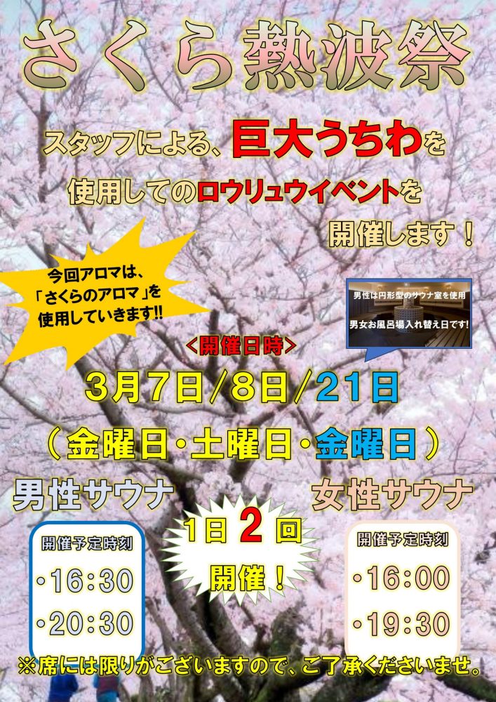 3月は桜の咲く季節ということでさくらのアロマを使用した「さくら熱波」を開催します!