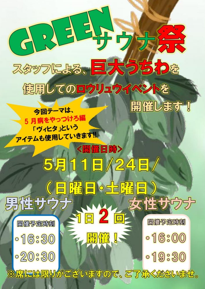 5月は、ヴィヒタを使用した「グリーンサウナ祭」として開催します。