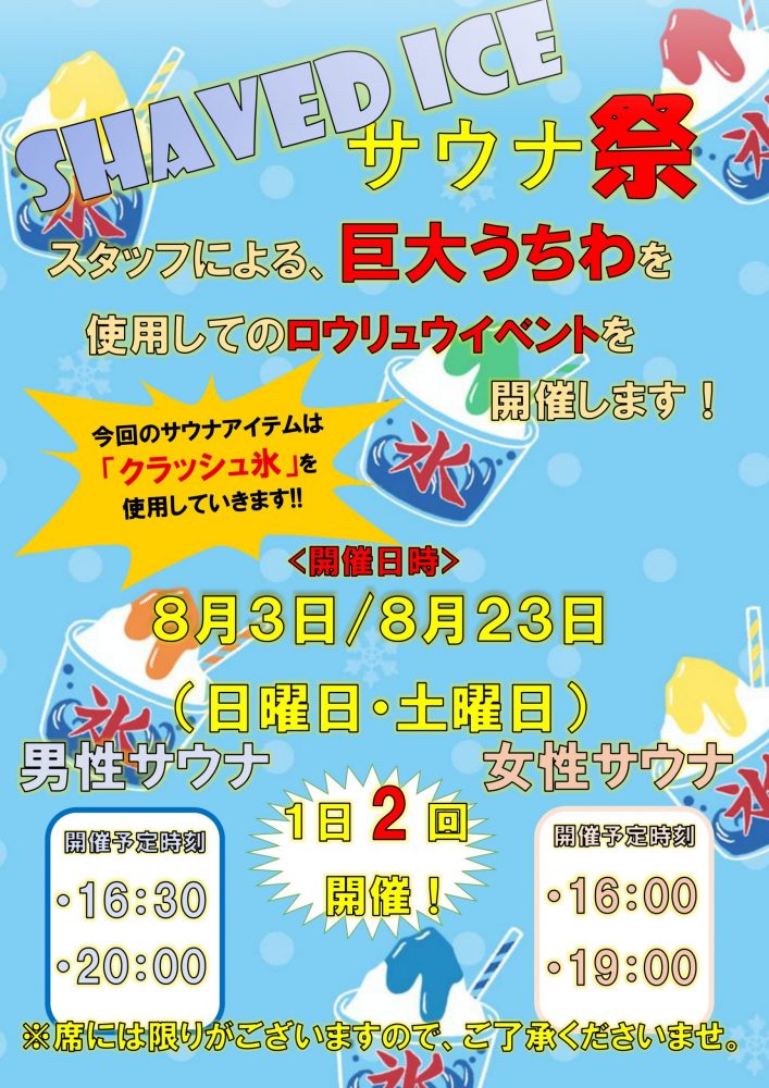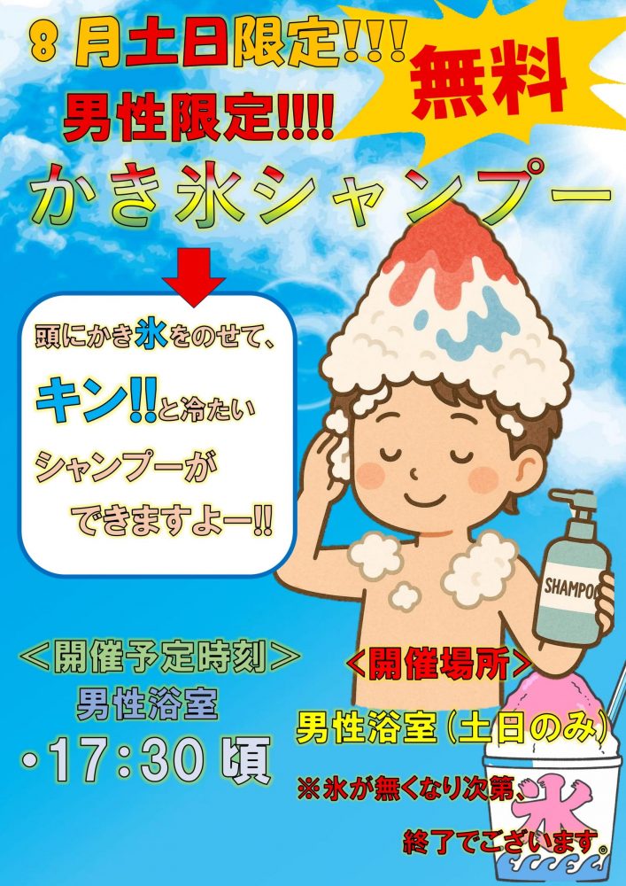 ①土日は男性浴室で「かき氷シャンプー」イベントを開催しています!