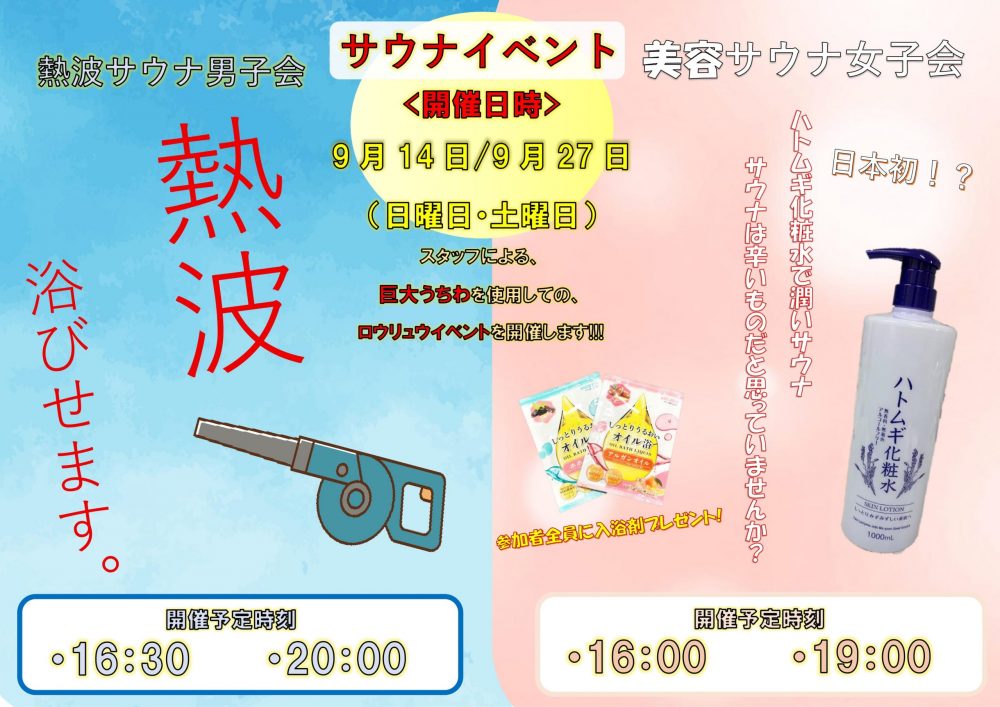 9月は女性の熱波は趣向を変えた「潤いサウナ女子会」として実施します💜