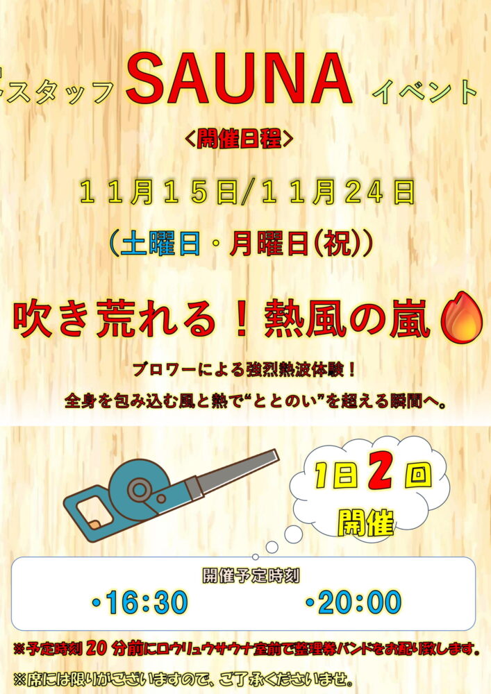 11月15日(土)・11月24日(月祝)の2日間は、大人気のスタッフ熱波イベントを開催します。