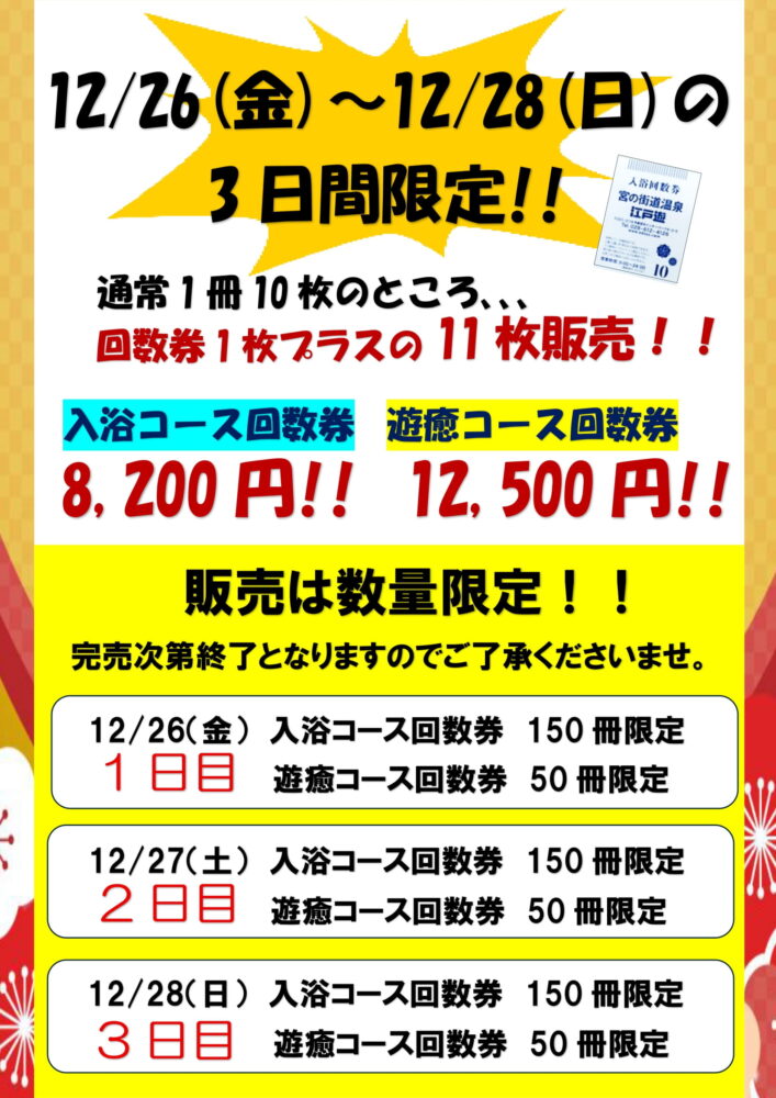 ◆遊癒コース回数券 1日50冊限定、11枚綴り12,500円(1枚あたり約1,136円)