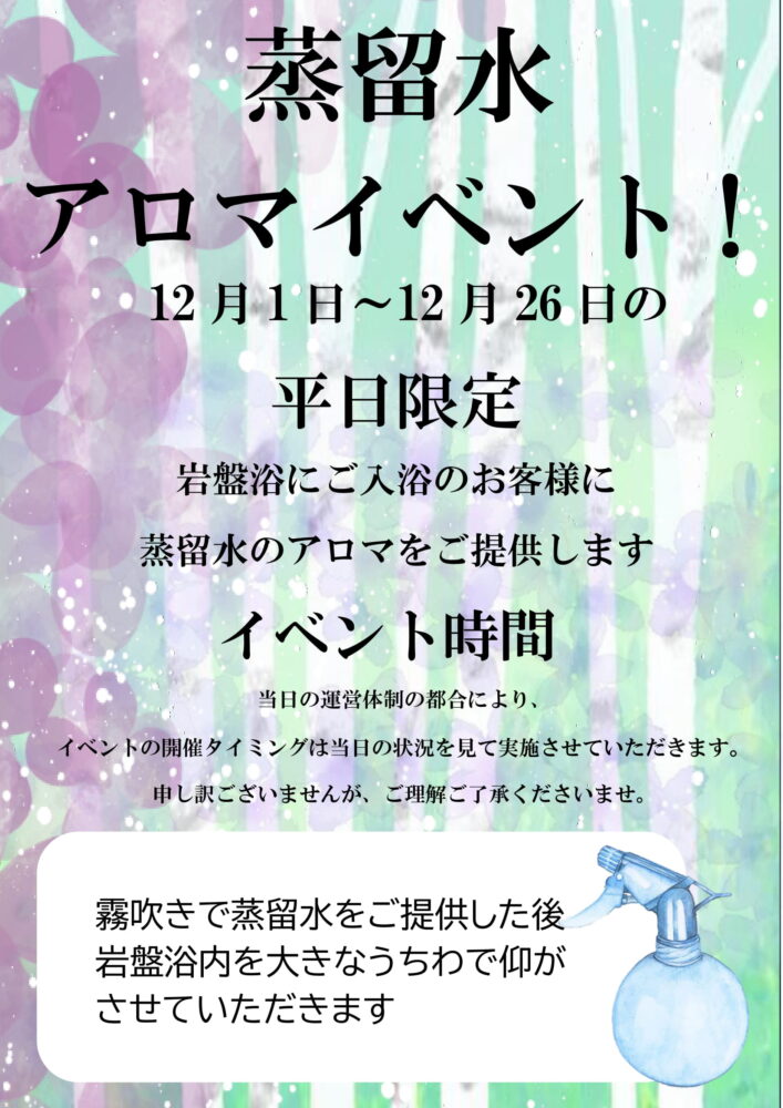 12/1(月)~12/26(金)までの平日1限定イベントです。1日1回、岩盤浴室内でスタッフがアロマ蒸留水を