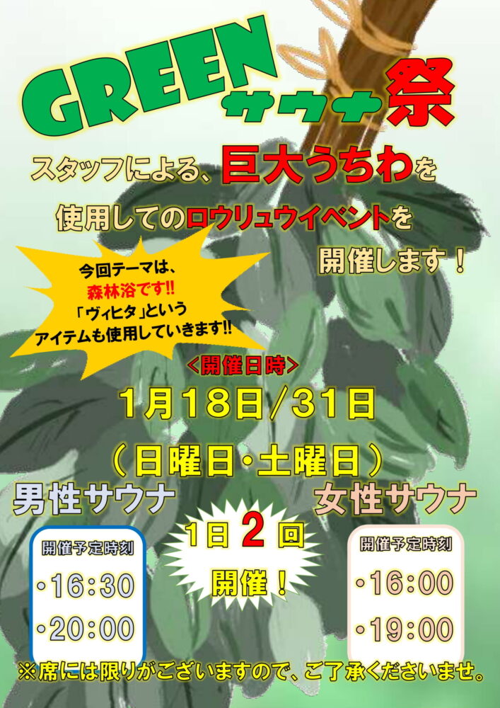 1月は男女とも「GREENサウナ祭」として、うちわの他にヴィヒタも使用して熱波を盛りあげます🍃