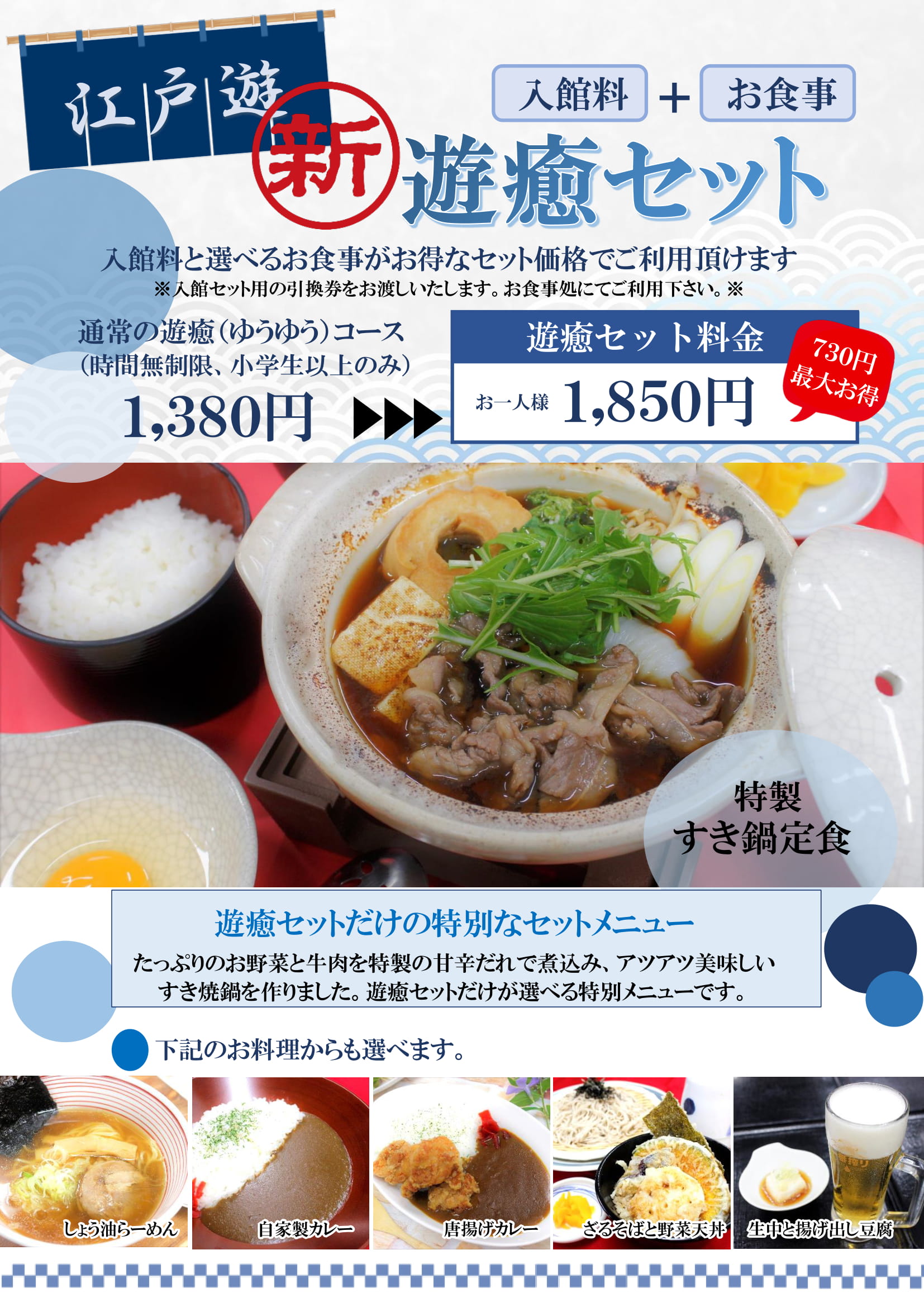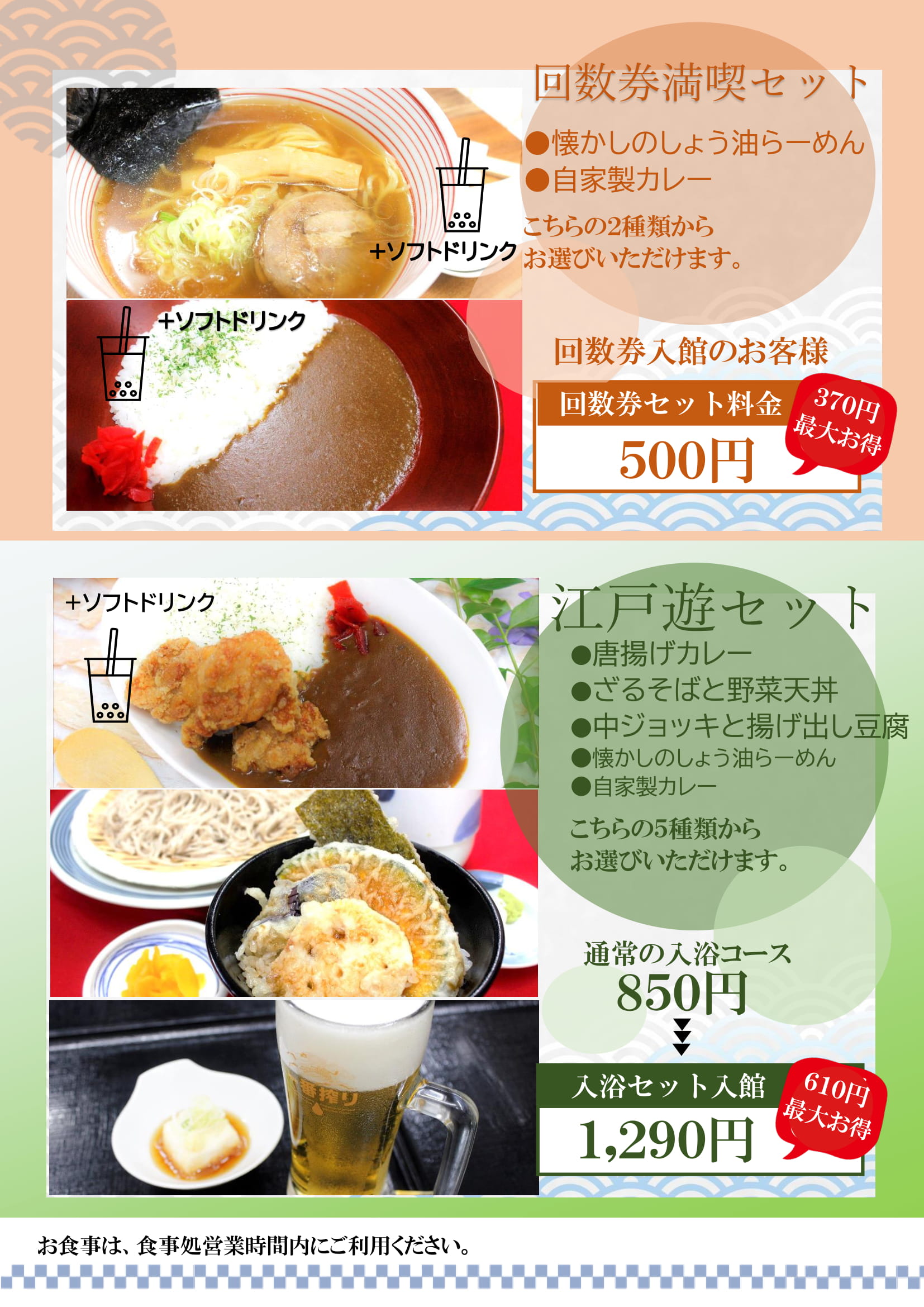 5/10(月)より、人気の入館料+お食事セットが大幅リニューアルいたしました! ☆メニュー一新 遊癒コースのお客様限定コースも新たに設定、 ご飯物、カレー、定食からとバリエーション豊かなメニューからお選びください(*´ω`*) ☆なんと今回は、回数券のお客様も利用頂けます!! 回数券1枚+500円でお食事が召し上がれます♪