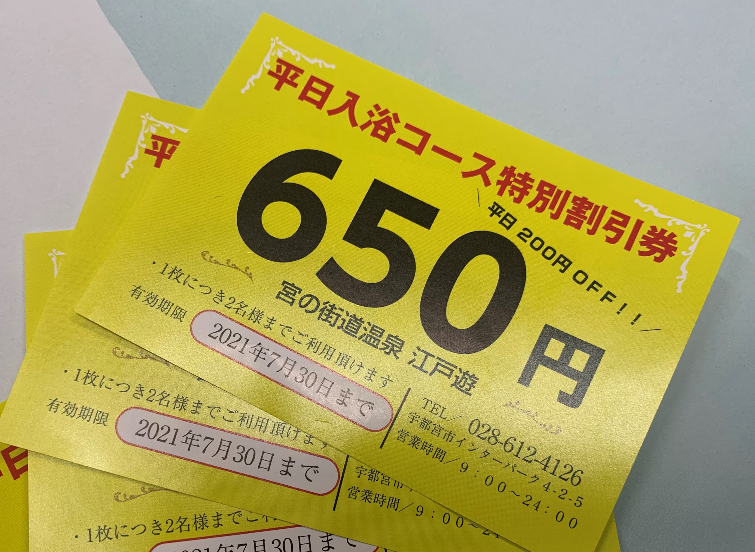 6/21(月)より期間限定で、ご入館のお客様に平日入浴コースが850円→650円になる 特別割引券をプレゼント致します!! ☆ご利用は7月末まで☆ ☆1枚で2名様までご利用頂けます 空いている平日にオトクにご利用して下さい(*'ω'*)