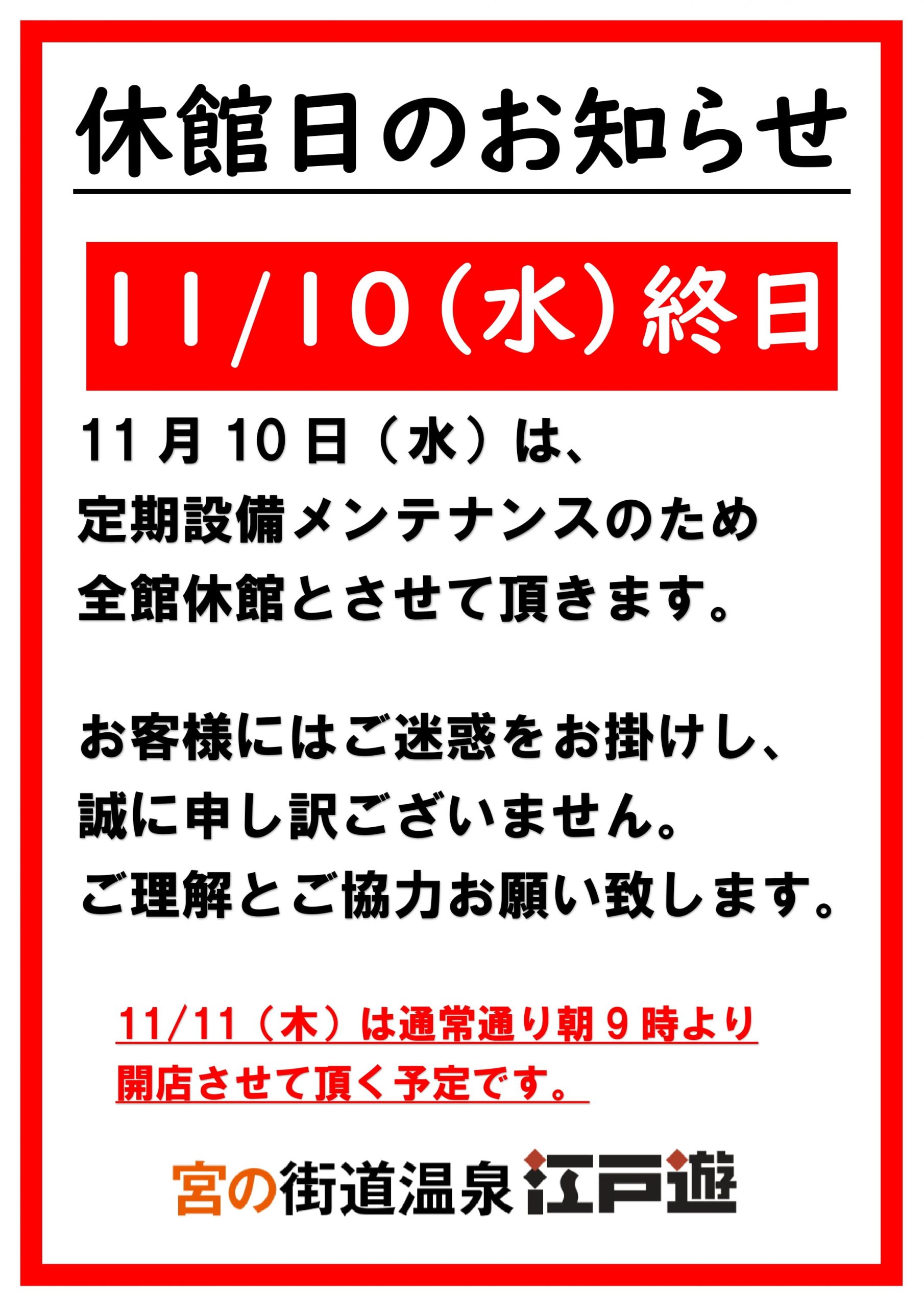 11/10(水)は、定期設備メンテナンスのため、終日休館とさせて頂きます。