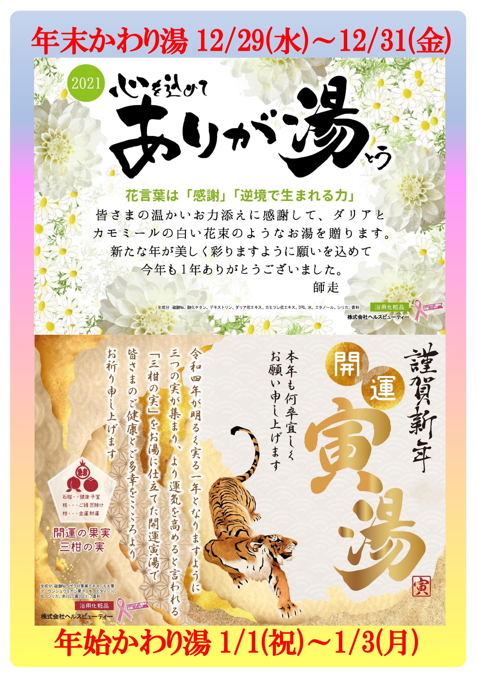 12/29(水)~1/3(月) 年末年始は2種類のかわり湯を開催!