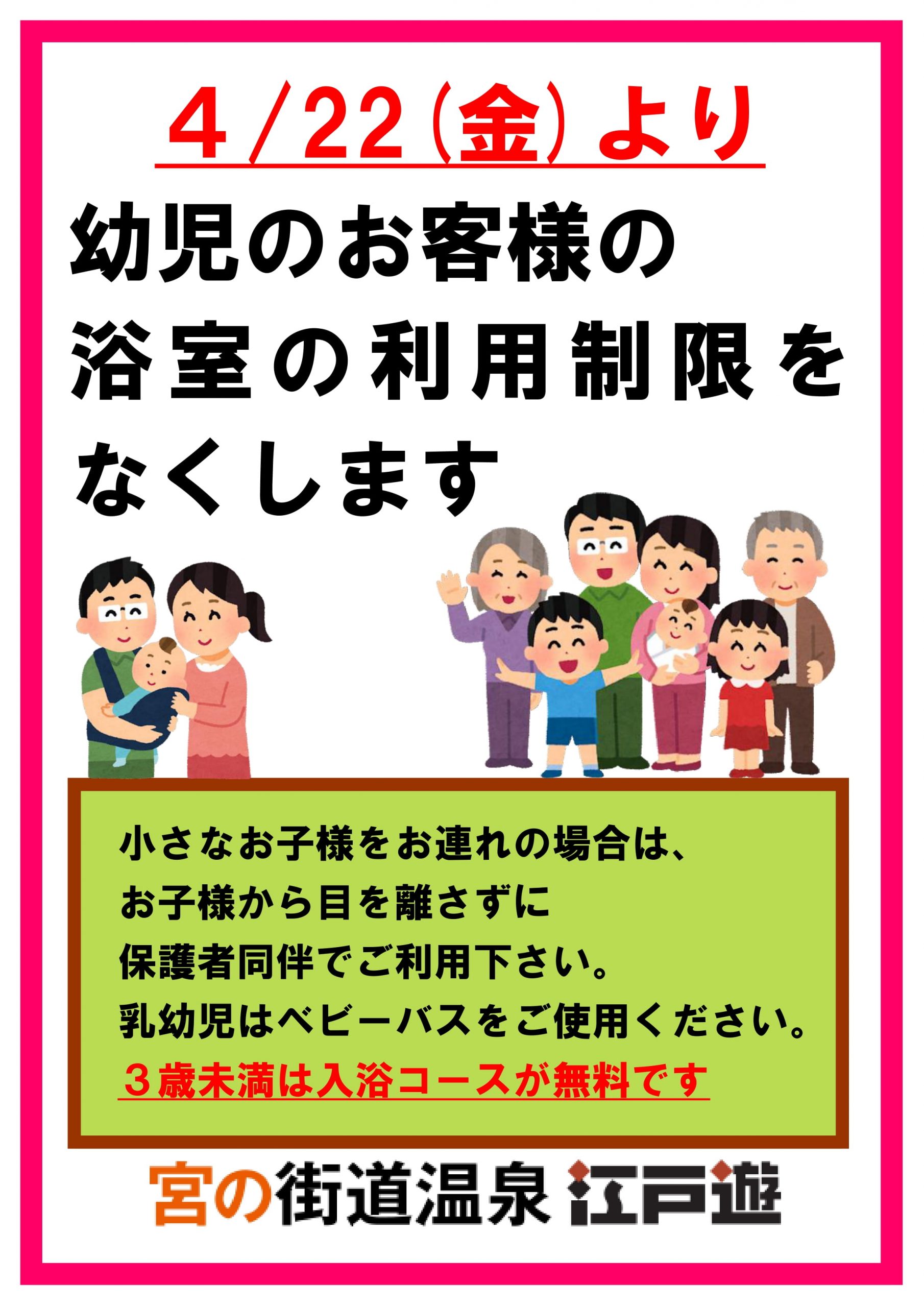 4/22(金)より、乳幼児のお客様も浴室と脱衣所がご利用できるようになります👶