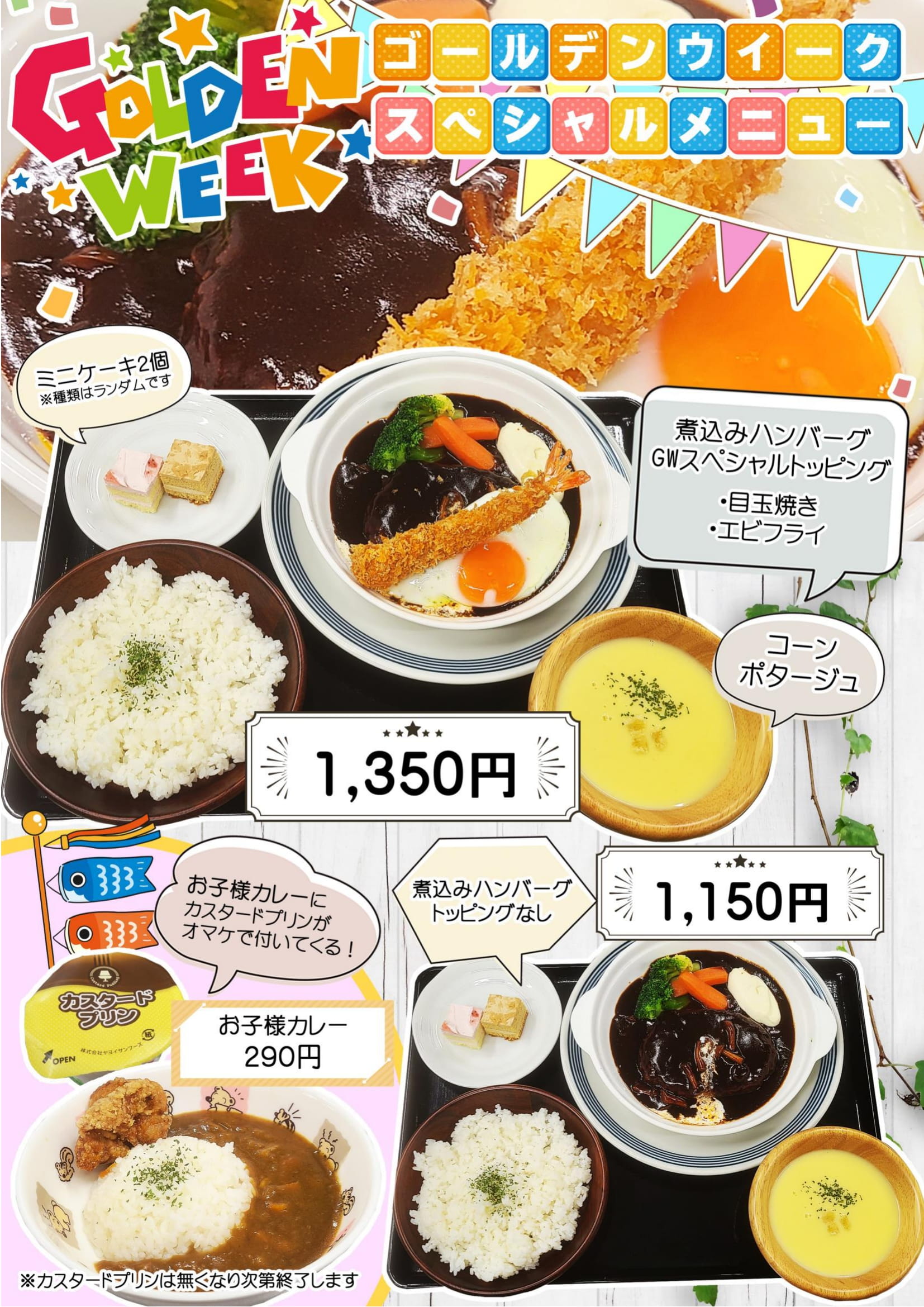 4/29(金)~5/8(日)まで、お食事処でゴールデンウイークの限定スペシャルメニューを販売します✨