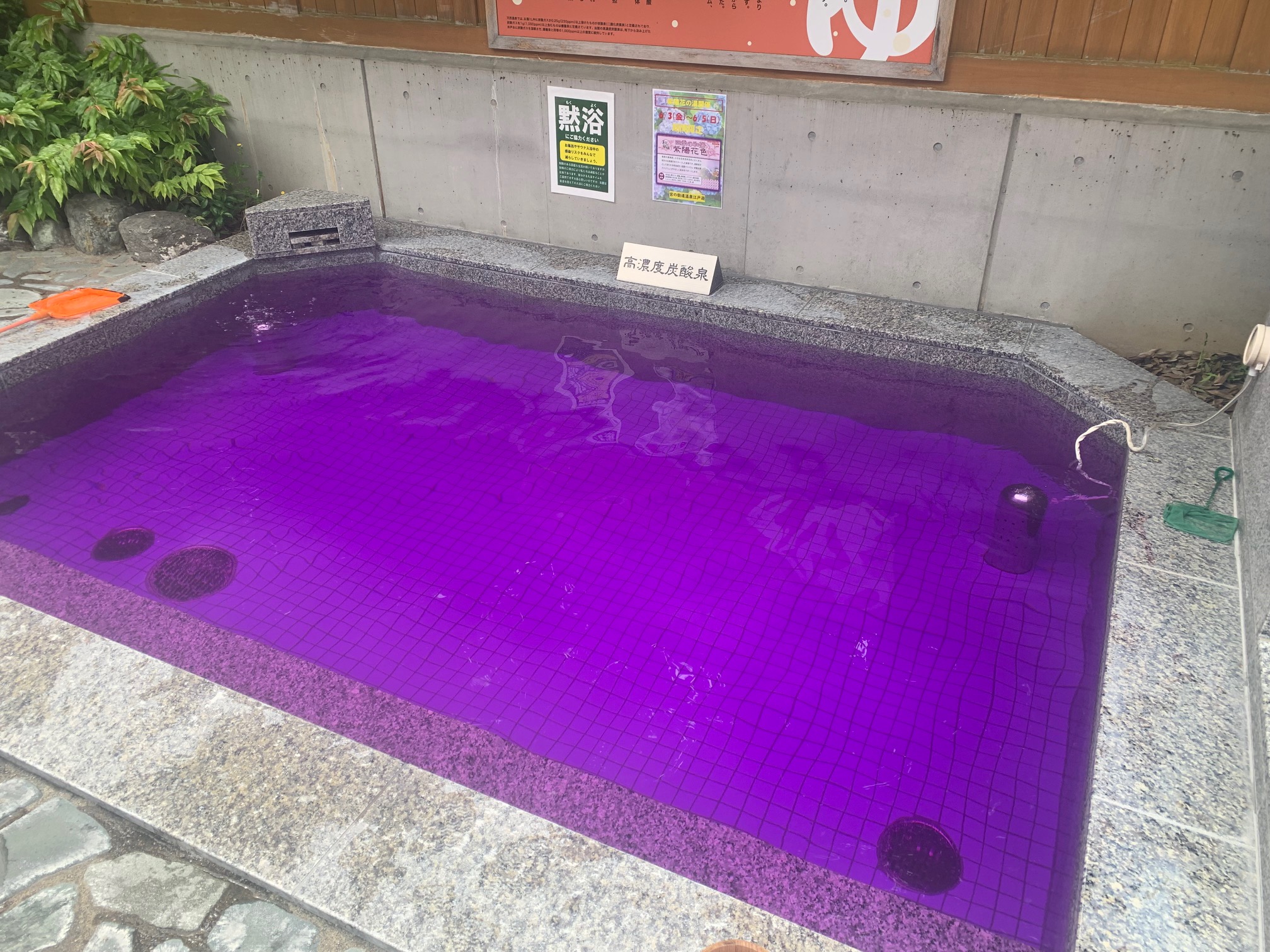 男女各露天風呂の炭酸泉にて、「あじさいの湯」を