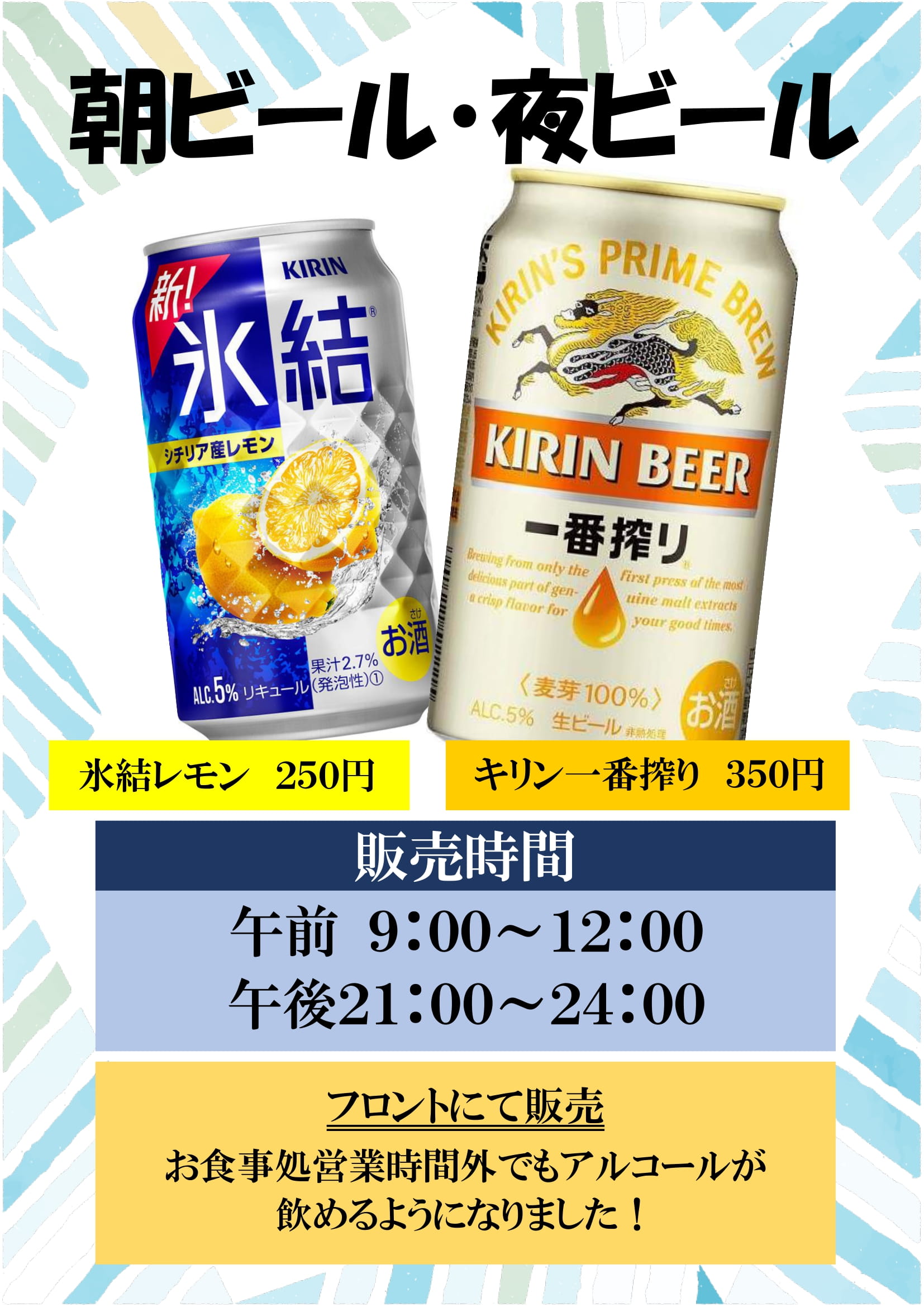 朝ビール🌞夜ビール🌛フロントで販売します🍺