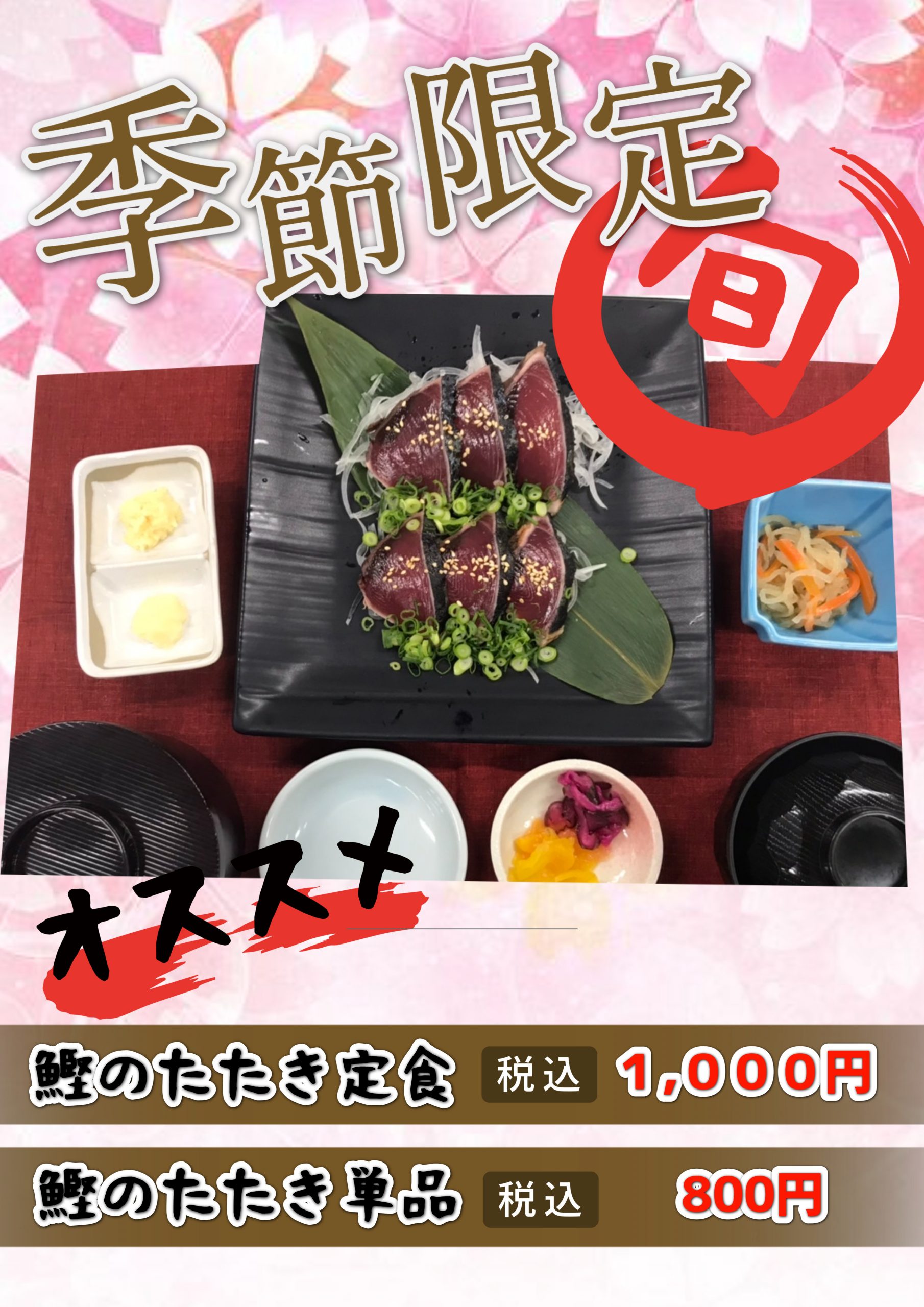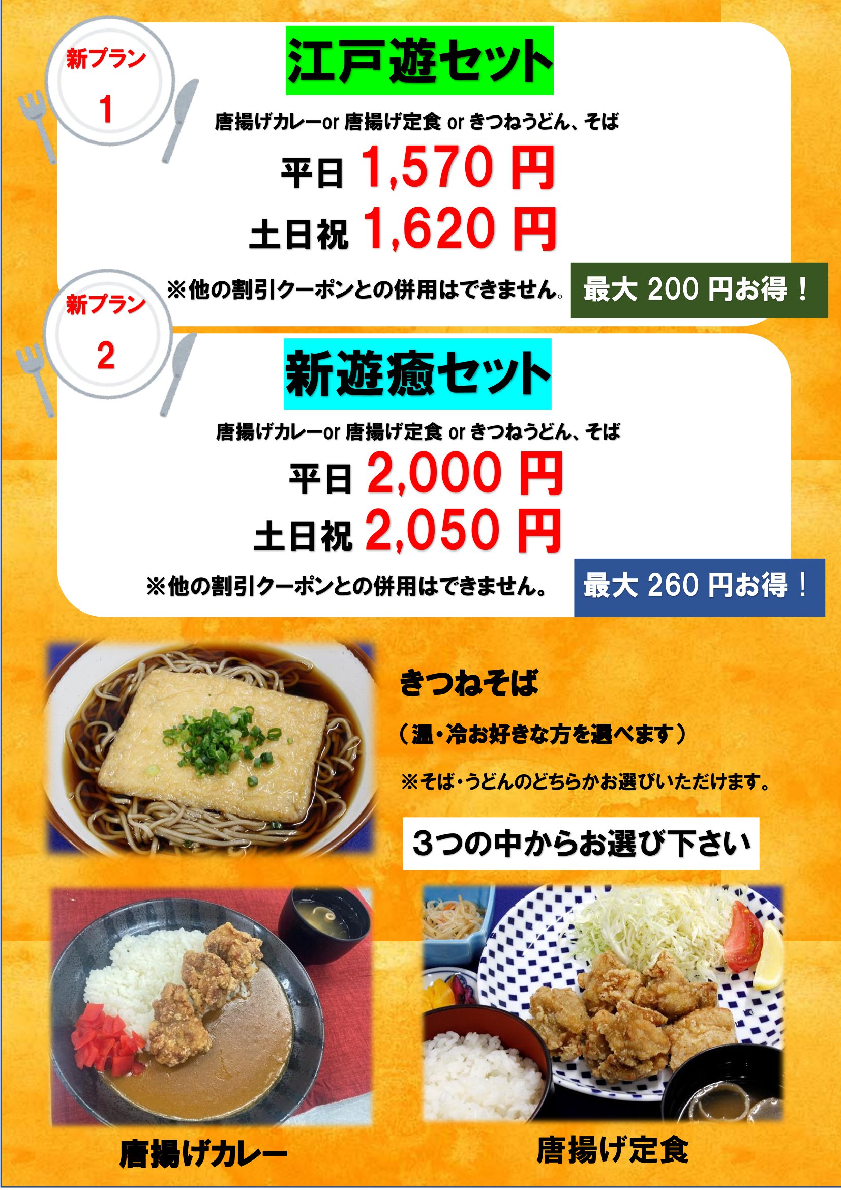 お食事処からのお知らせ💡 4/1(土)~ 💛入館&お食事セットのメニューが増えます🙌  🦊きつねそば(温・冷選べます)  大きなお揚げが美味しいですよ!  平日・休日と入浴コース/遊癒コースで料金が異なりますが、  別々に注文するよりも最大260円お得です!! ◇ご入館時にフロントでお申し出ください。 💚期間限定新メニュー  🐟かつおのたたき定食(単品もあります)  旬の味覚を薬味と一緒にお召し上がり下さい🤤  カツオのたたき定食:1,000円  カツオのたたき単品:800円←おつまみにも!!
