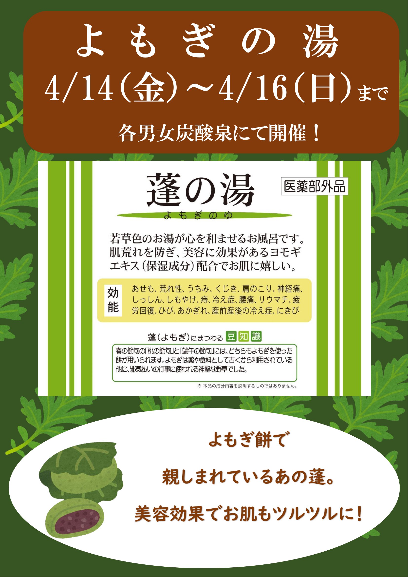 4/14(金)~4/16(日)かわり湯「よもぎの湯」開催♨