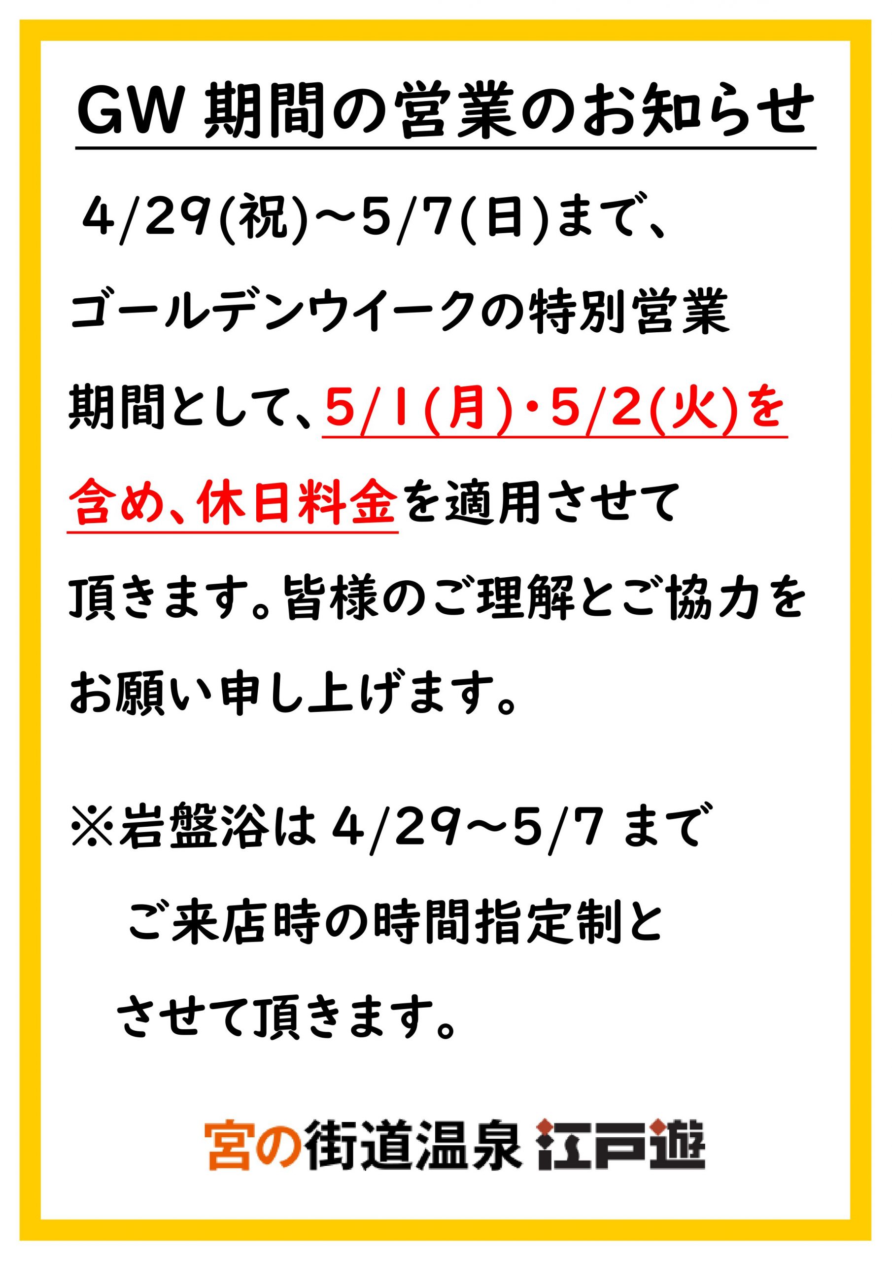 4/29(祝)~5/7(日)までのあいだは、ゴールデンウイークの特別営業期間として