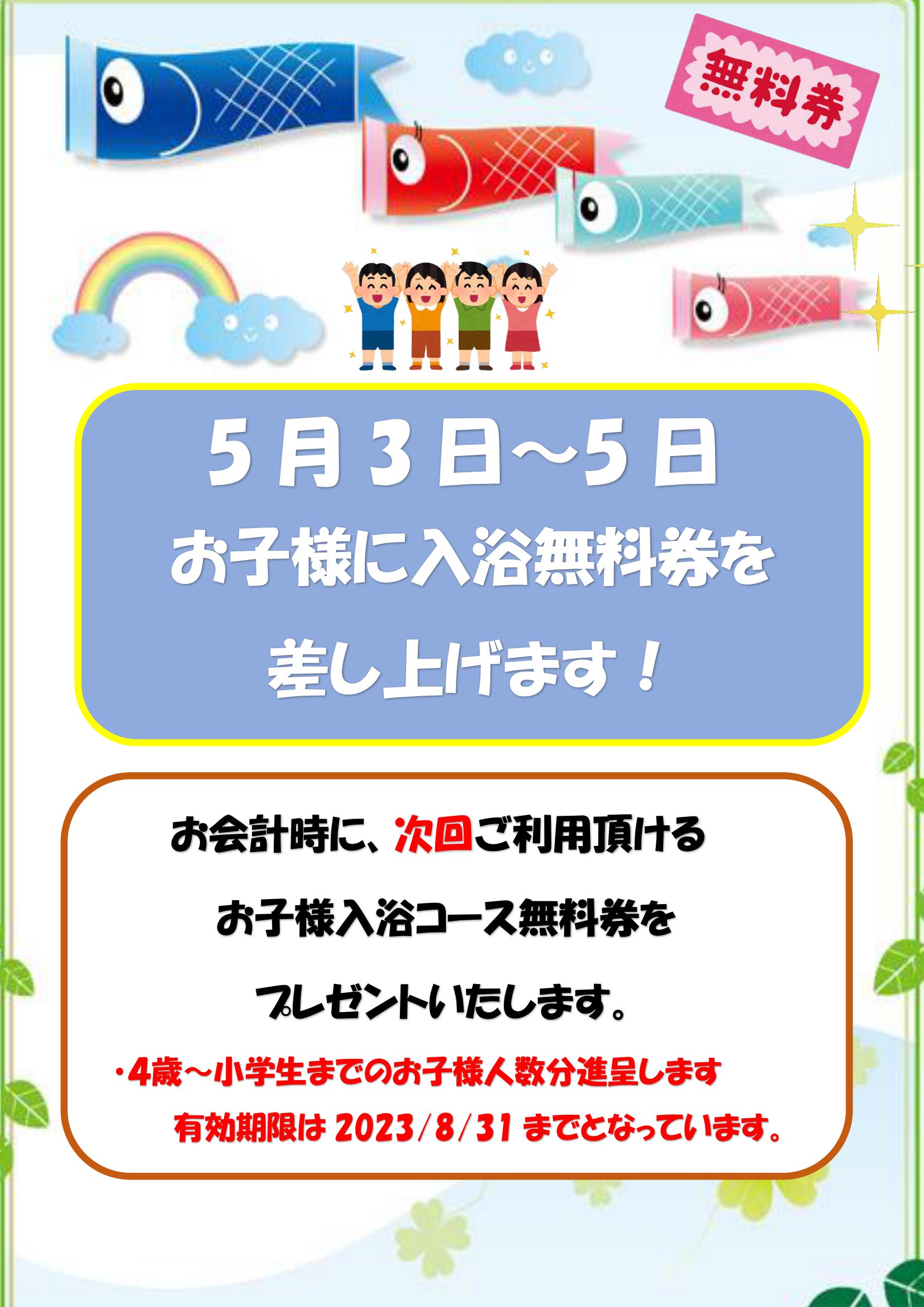 4歳~小学生のお客さまを対象に、次回利用できる子供入浴コース無料券を