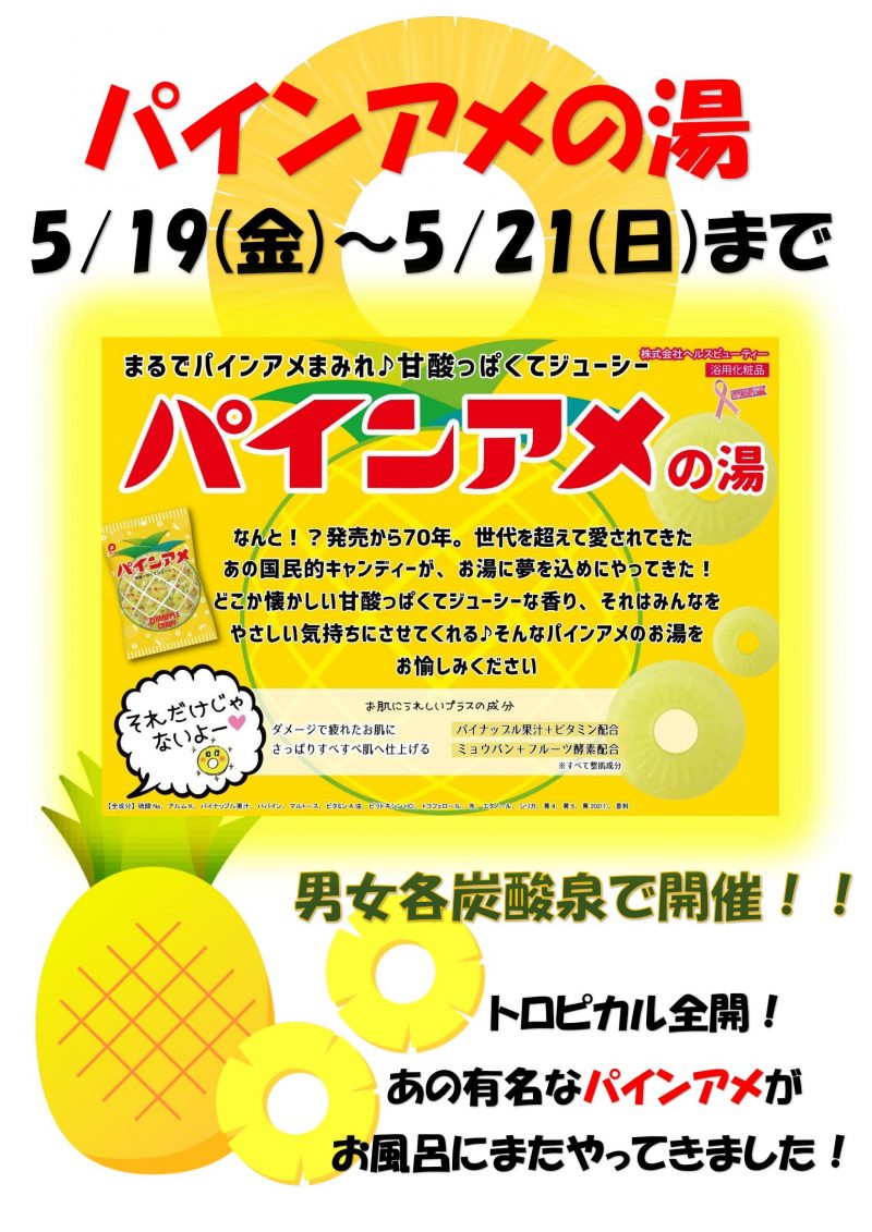 5/19(金)~5/21(日)かわり湯「パインアメの湯🍍」開催♨