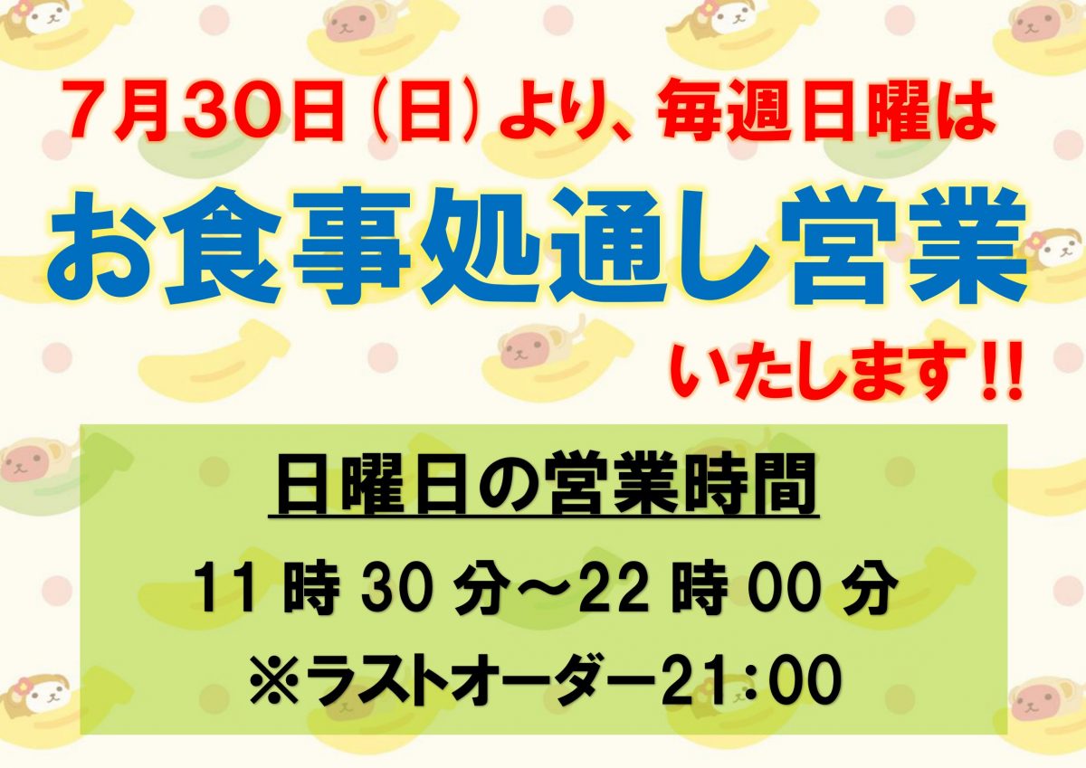 7/30(日)より、毎週日曜日はお食事処を通し営業します🍽